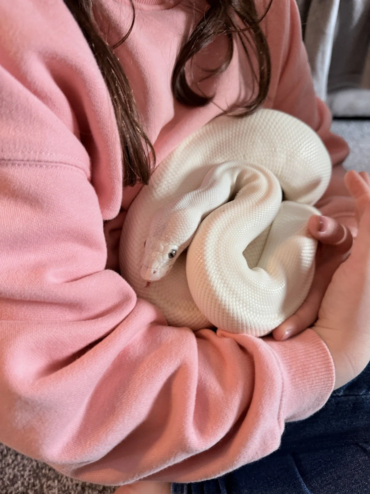 Although she’s not the biggest, she’s definitely one of the most beautiful snakes you’ll ever meet (inside and out). With icy blue eyes and an almost ethereal aura around her, she loves nothing more than to snuggle in your arms.