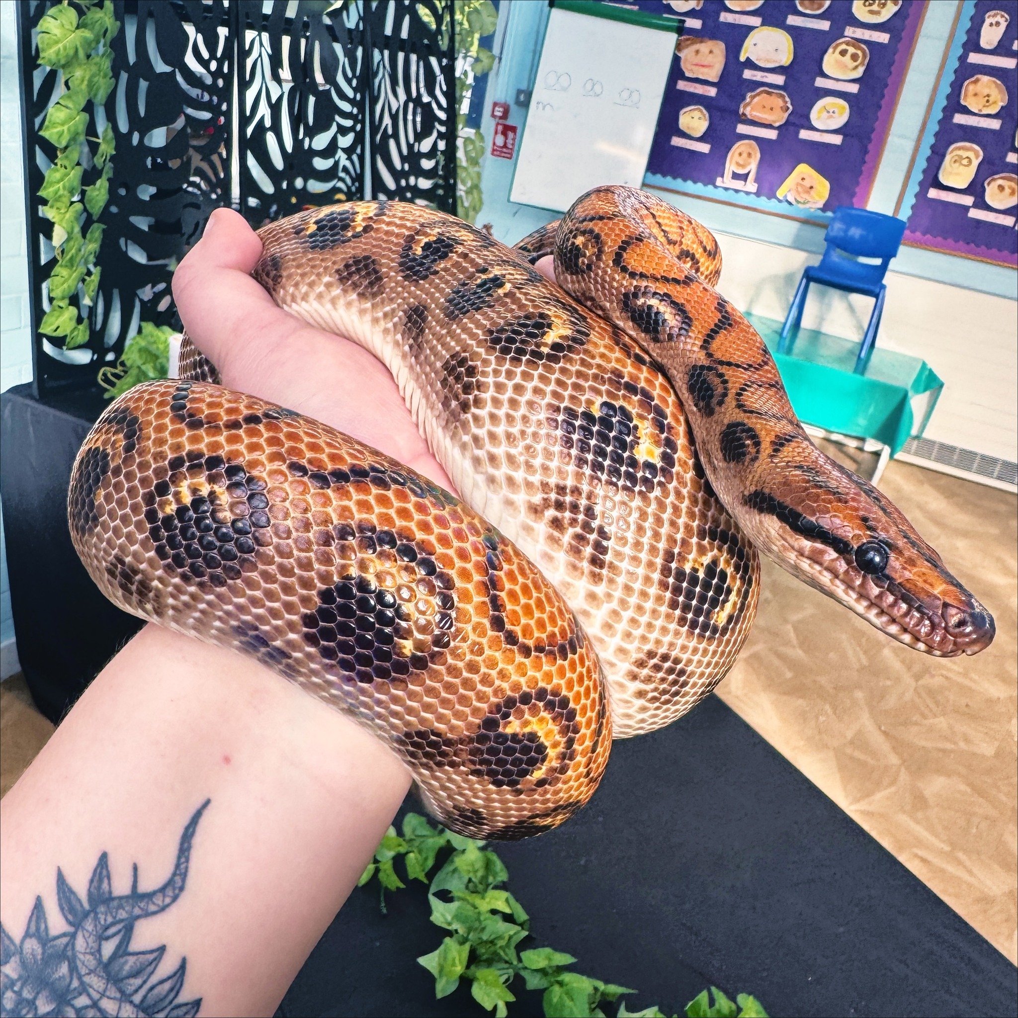 At an impressive 9ft currently, our show-stopping Lady M may get to around 16ft when she’s fully grown. We re-homed her from a family who couldn’t give her the space she needed any more, and she now spends her time either basking in the garden on warmer days…or giving her infamous ‘Marmalade Cuddles’ when she’s out meeting people with us.