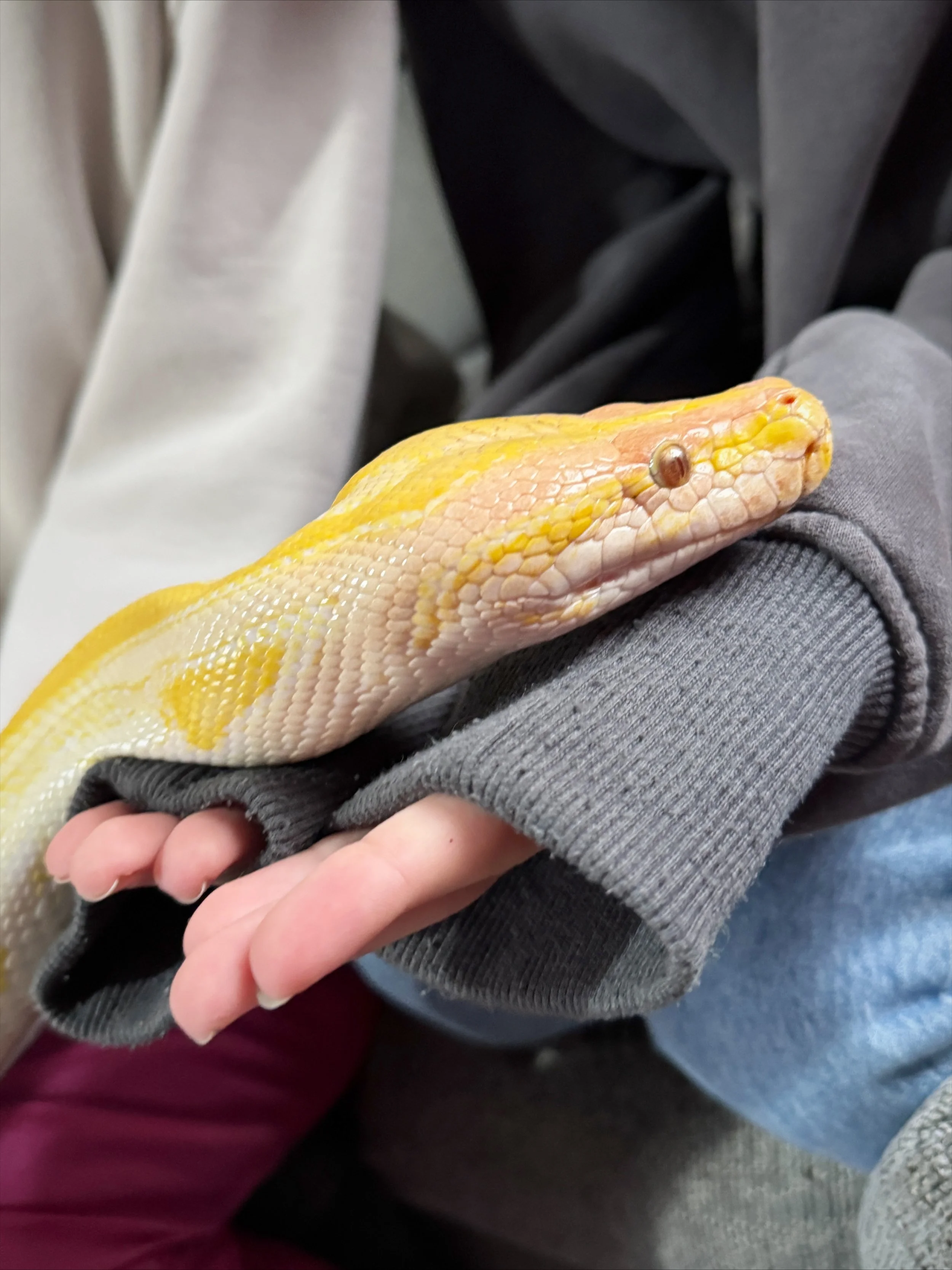 During sessions, Luna is often a first point of connection for those who feel unsure around reptiles. Some people choose to hold her with guidance; others simply enjoy watching her rest and move peacefully nearby. There is no expectation either way — Luna is just as content being observed as she is being held.